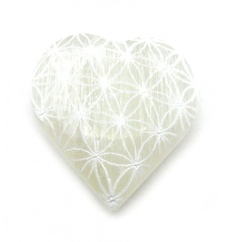 Herz Selenit (Fasergips) 5 - 5,5 cm mit Gravur Blume des Lebens