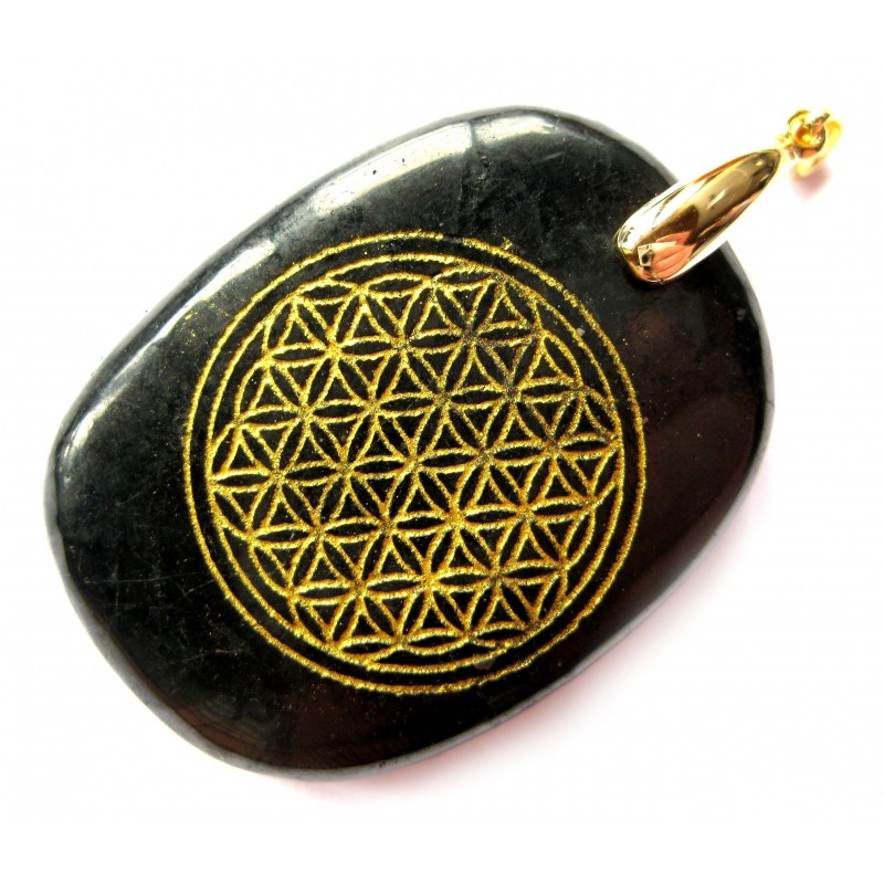 Anhänger Schungit (Steinkohle) mit Blume des Lebens goldfarben