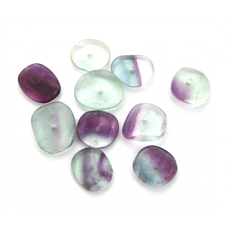 10 unregelmäßige Scheiben gebohrt 9-13 mm Fluorit bunt mit sehr feiner Bohrung