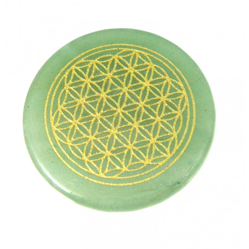 Scheibe Grünquarz 3,5 cm mit Gravur goldfarben Blume des Lebens
